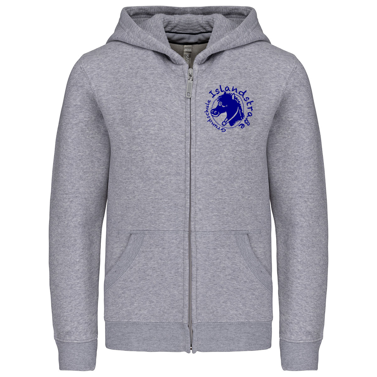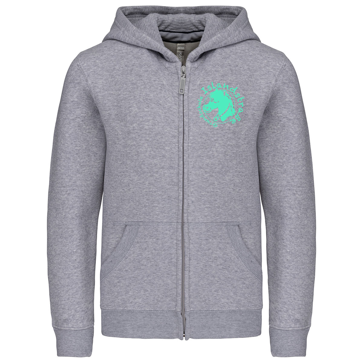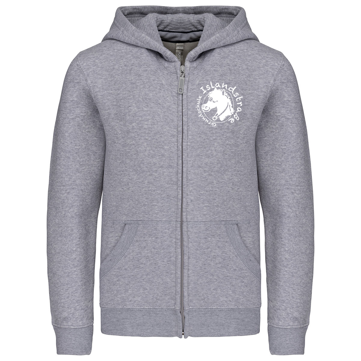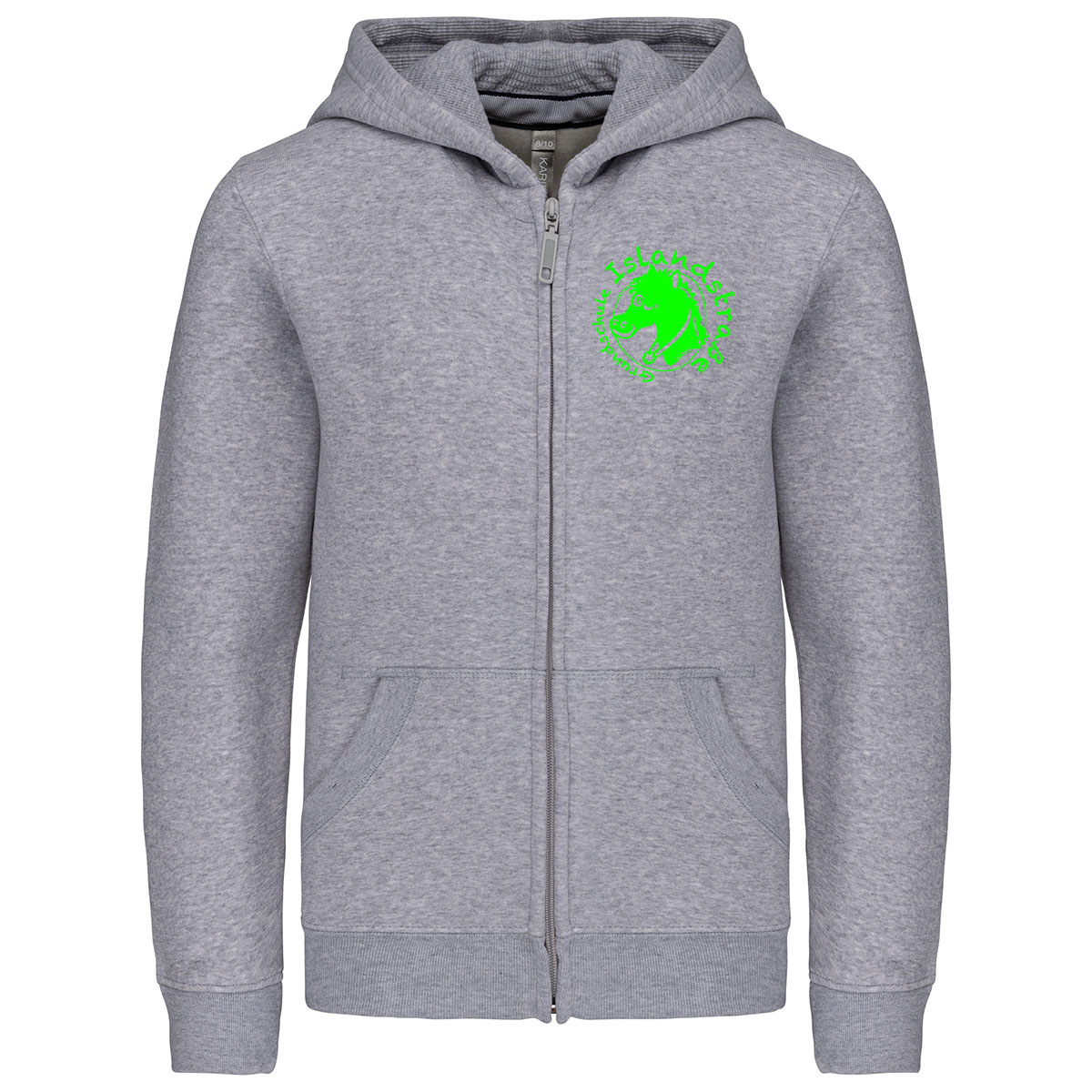 80% gekämmte Baumwolle / 20% Polyester. Gebürstetes Fleece. Verstärktes Kontrast-Nackenband (Heather Grey für alle Farben, Middle Grey für Oxford-Grey). Kängurutasche. Gerippt an Bund und Saum. Gefütterte Kapuze. Reißverschluss. Zertifizierte STANDARD 100 by OEKO-TEX®N° CQ1007/7, IFTH.