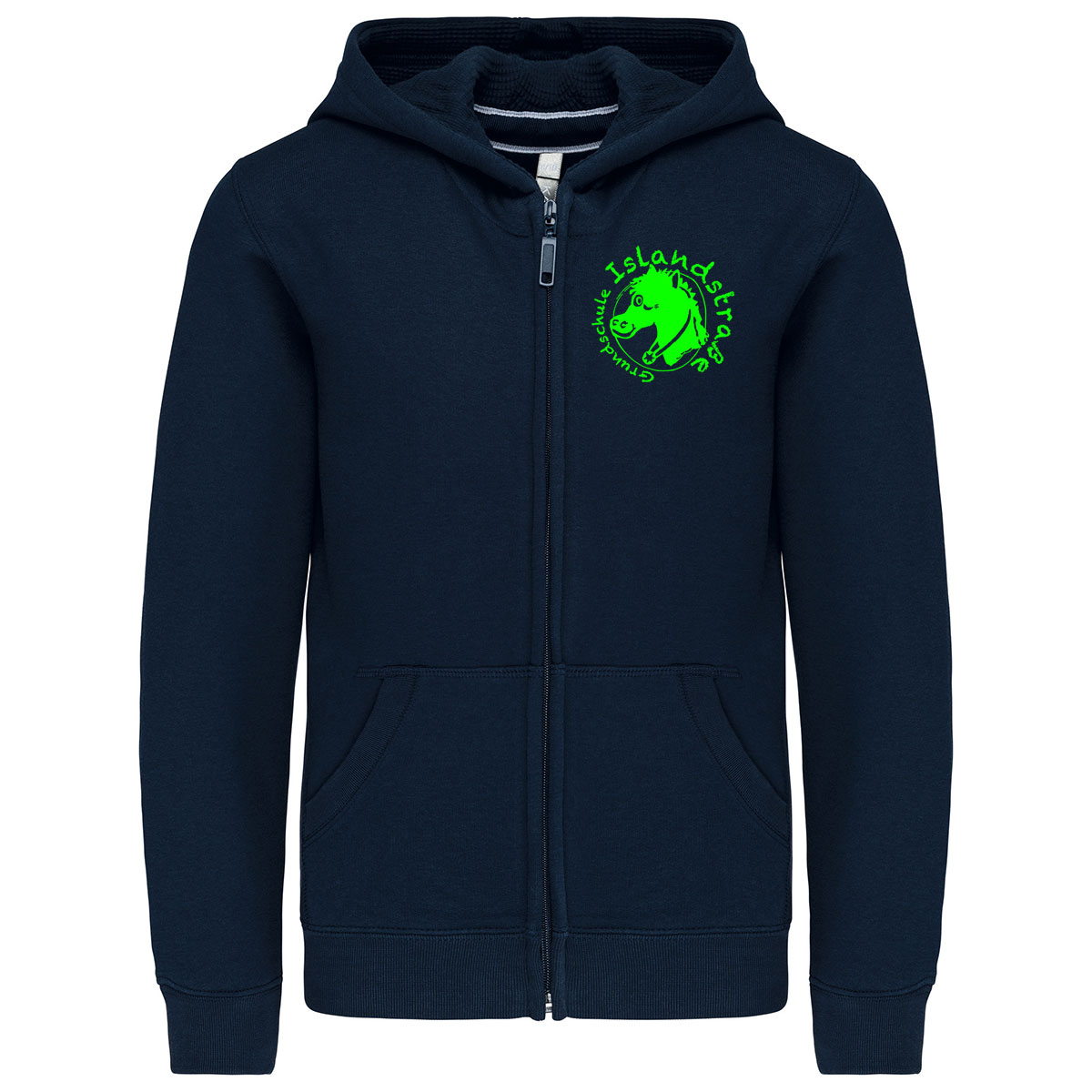 80% gekämmte Baumwolle / 20% Polyester. Gebürstetes Fleece. Verstärktes Kontrast-Nackenband (Heather Grey für alle Farben, Middle Grey für Oxford-Grey). Kängurutasche. Gerippt an Bund und Saum. Gefütterte Kapuze. Reißverschluss. Zertifizierte STANDARD 100 by OEKO-TEX®N° CQ1007/7, IFTH.